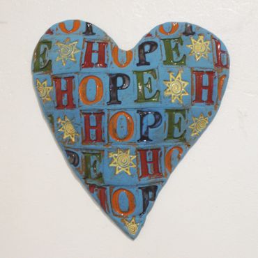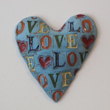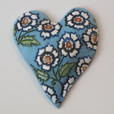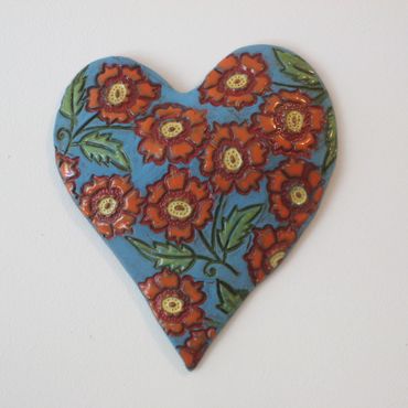 Each heart is unique in shape and color. They are approximately 6" x 7" and hang easily on the wall on a single nail. They are high fired stoneware so are suitable for indoor or outdoor use.